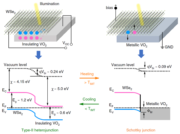 针对这一关键问题,刘锴课题组另辟蹊径,搭建出WSe2/VO2垂直异质结,巧妙地利用VO2在68摄氏度下发生的绝缘相-金属相转变,动态调控异质结的类型,进而改变异质结的最佳工作模式。当VO2处于绝缘相(本质上为半导体)时,异质结种类为II类半导体p-n结,器件适合工作在光伏模式,而当VO2转变为金属相时,异质结种类变为肖特基节,器件可以工作在光导模式。利用这一策略,通过可逆地控制VO2的相态,实现WSe2/VO2光电探测器件工作模式的动态切换,最终获得了同时兼具高响应率(6.6 A/W)和高探测率(1.87×1013 Jones)的光电探测器件。这一研究为发展新型高性能光电探测器件提供了新思路,同时也是刘锴课题组继NbS2-NbOx阻变异质结工作(ACS Nano 2019, doi: 10.1021/acsnano.9b06627)之后在TMDs/TMOs异质结领域的又一创新性工作。